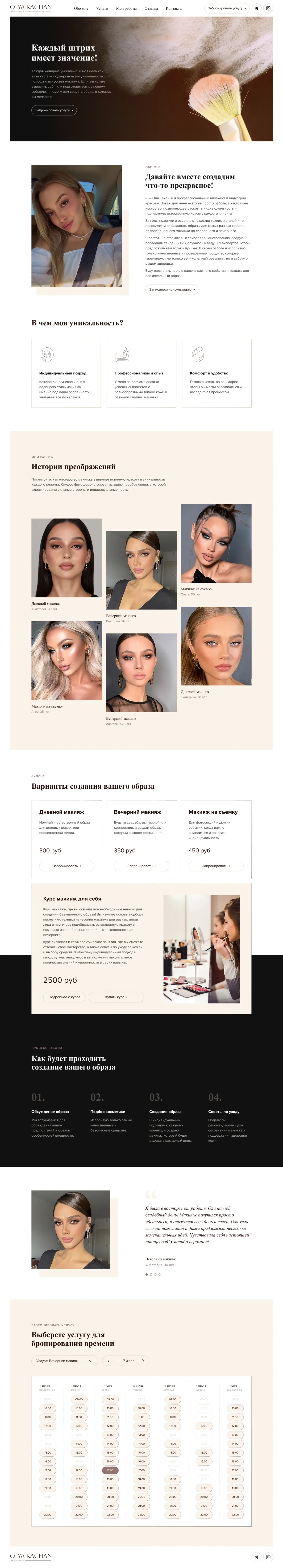 Решение: Создали имиджевый лендинг для визажиста с акцентом на персональный бренд. Сайт демонстрирует портфолио работ, формирует доверие через отзывы клиентов и обеспечивает удобную запись на услуги. Дизайн отражает стиль мастера, а функциональность направлена на привлечение целевой аудитории.
